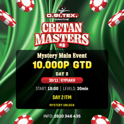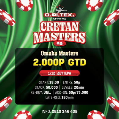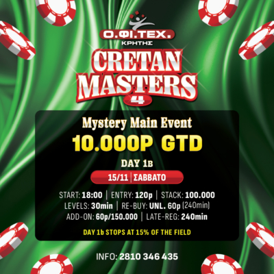 Ο Ο.ΦΙ.ΤΕΧ. Κρήτης παρουσιάζει το Cretan Masters ΙIII, από 8 Νοεμβρίου έως 4 Δεκεμβρίου, με 10.000p GTD στο Mystery Main Event και 2 ακόμη τουρνουά γεμάτα αδρεναλίνη! ♠️♥️