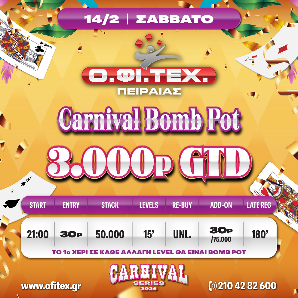 Carnival Bomb Pot → Πόντοι: 30p → Μάρκες: 50.000 → Blinds Level: 15 Min → Re-Buy: Unlimited → Add-on: 30p/75.000 → Late Reg. 180 Min