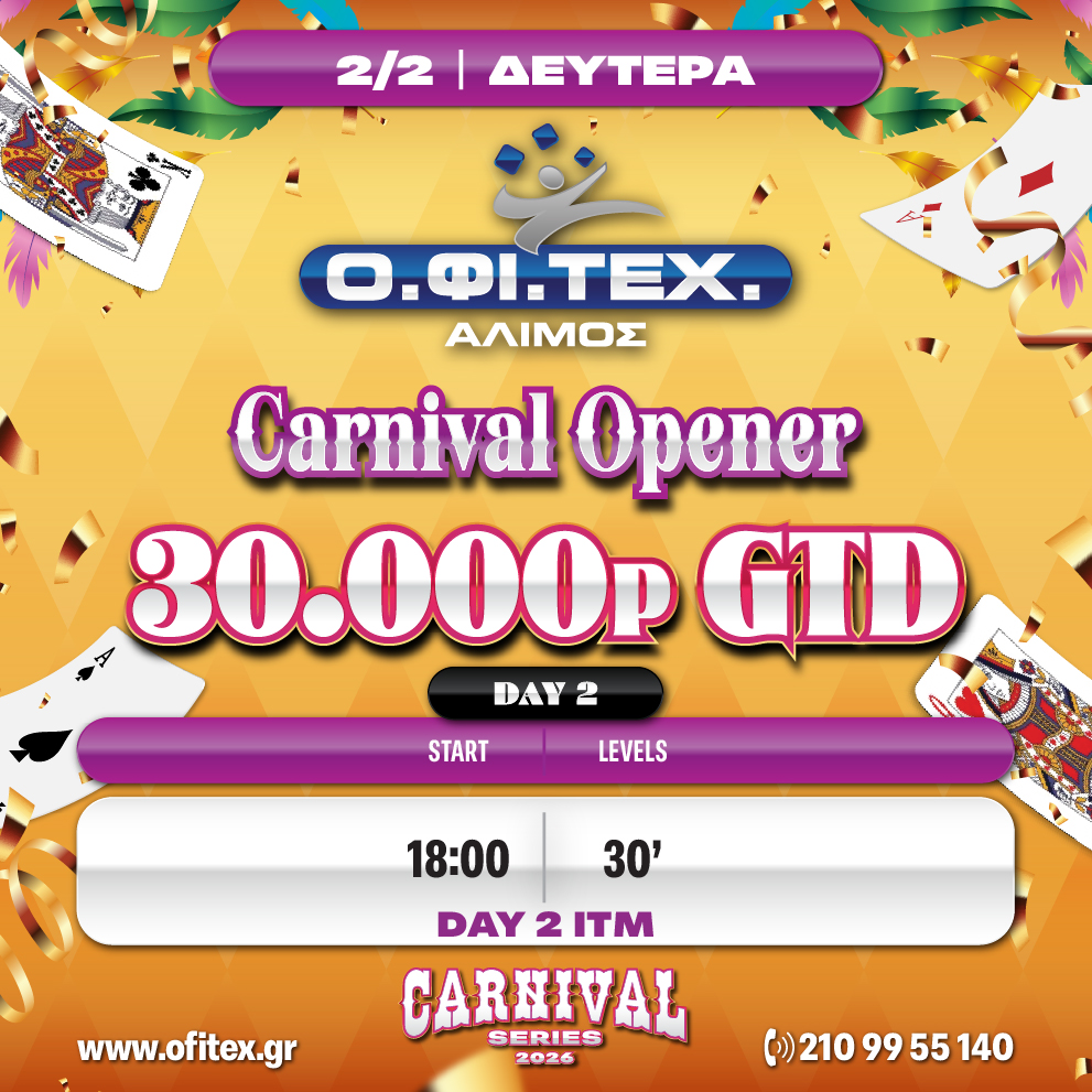 Carnival Opener Day 2 – 30.000p GTD (c) Carnival Opener Event Day 2 → Blinds Level: 30 Min Day 2 ITM 00 days 00 hours 00 minutes 00 seconds Date 02 Φεβ 2026 Time 18:00 - 22:00 Επιλογή αίθουσας Νότια Προάστια / Άλιμος Θεσσαλίας 3, 17456, Άλιμος Κατηγορίες Special Events Διοργανωτής ΟΦΙΤΕΧ Αθήνας Email info@ofitex.gr Website www.ofitex.gr Share this event