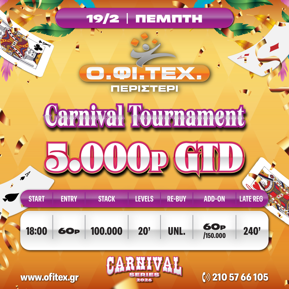 Carnival Tournament → Πόντοι: 60p → Μάρκες: 100.000 → Blinds Level: 20 Min → Re-Buy: Unlimited → Add-on: 60p/150.000 → Late Reg. 240 Min