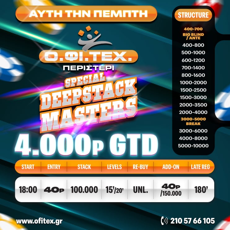 Deepstack Masters → Πόντοι: 40p → Μάρκες: 100.000 → Blinds Level: 15 Min/ 20 Min after break → Re-Buy: UNLIMITED → Add-on: 40p/150.000 → Late Reg. 180′
