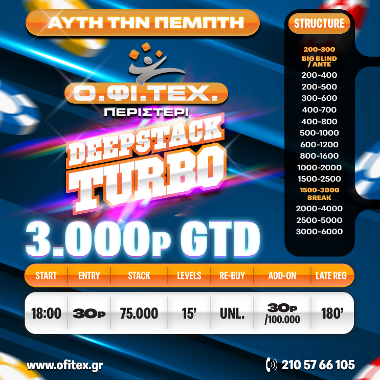 Deepstack Turbo → Πόντοι: 30p → Μάρκες: 75.000 → Blinds Level: 15 Min → Re-Buy: UNLIMITED → Add-on: 30p/100.000 → Late Reg. 180′
