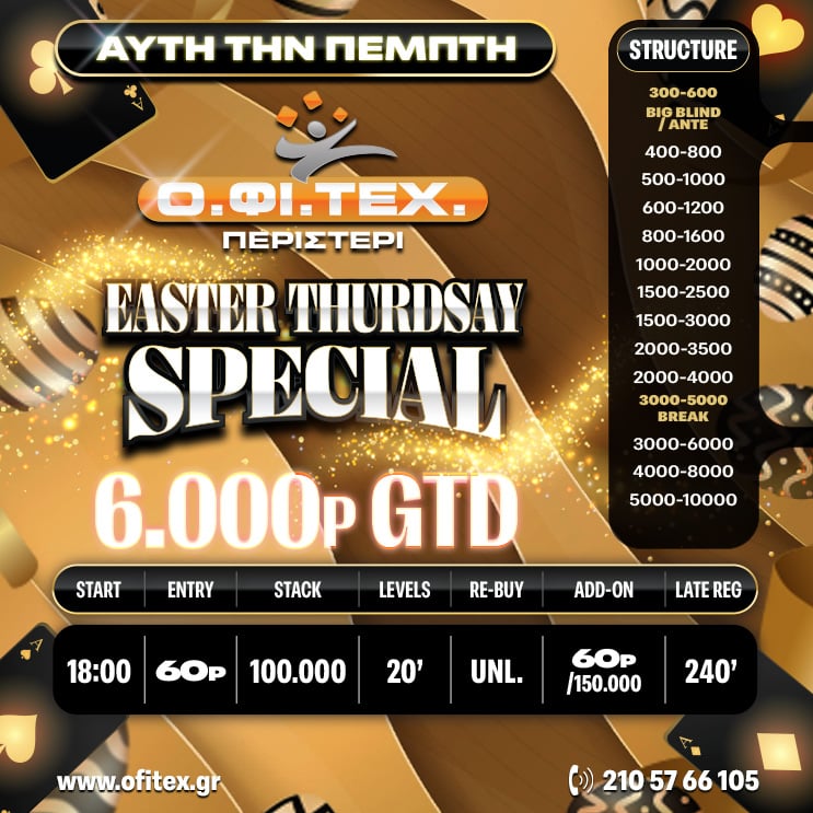 Easter Thursday Special → Πόντοι: 60p → Μάρκες: 100.000 → Blinds Level: 20 Min → Re-Buy: UNLIMITED → Add-on: 60p/150.000 → Late Reg. 240′