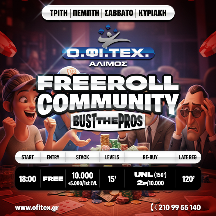 Freeroll Community Bust the Pros@18.00 / Πόντοι: Δωρεάν / Μάρκες: 10.000 (+5.000 για όσους εγγραφούν έως τις 18.15) / Level: 15 Min / Re-Buy: Unlimited (2p/10.000) / Late Reg. 120′