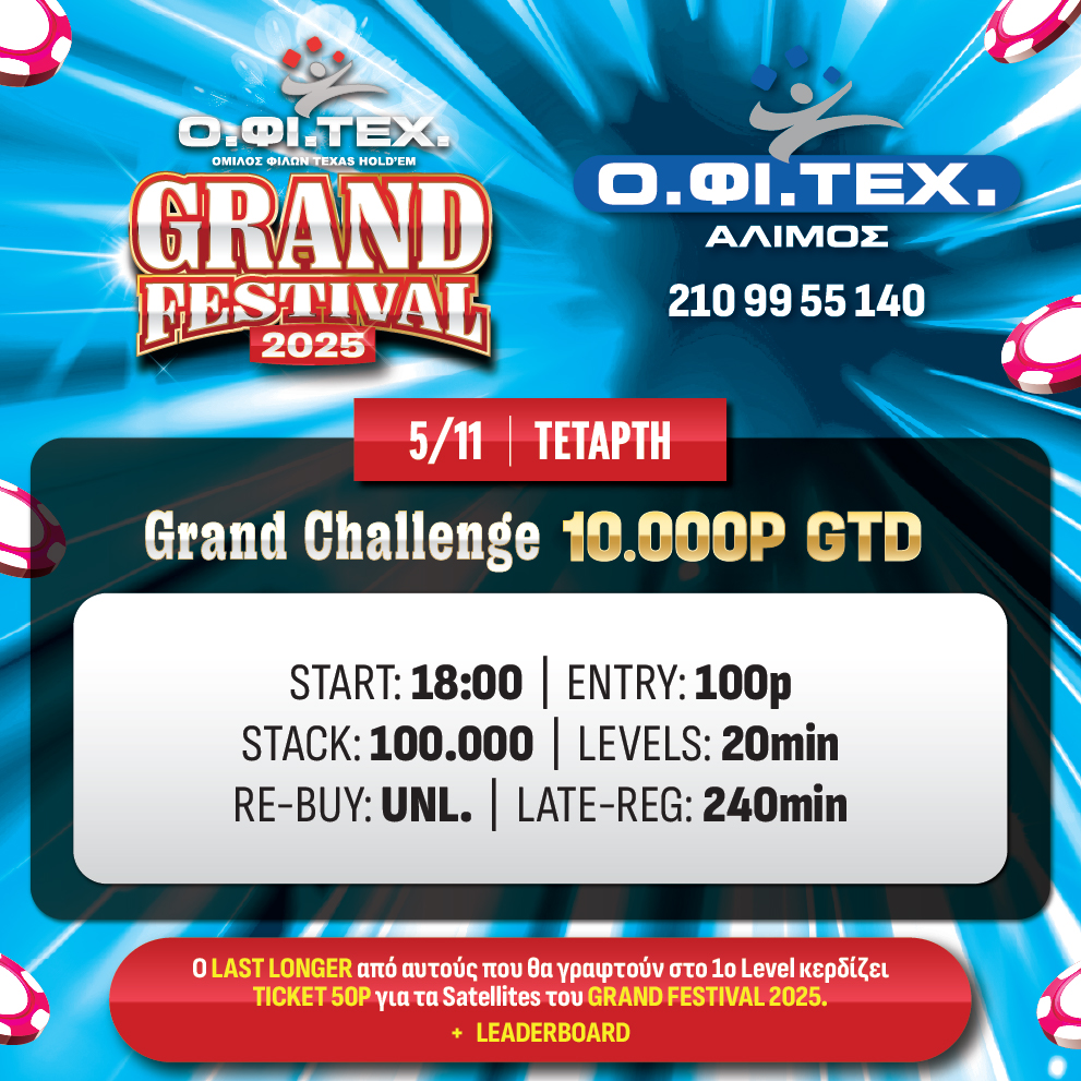 Grand Challenge → Πόντοι: 100 → Μάρκες: 100.000 → Blinds Level: 20 Min → Re-Buy: Unlimited → Late Reg.: 240 Min.
