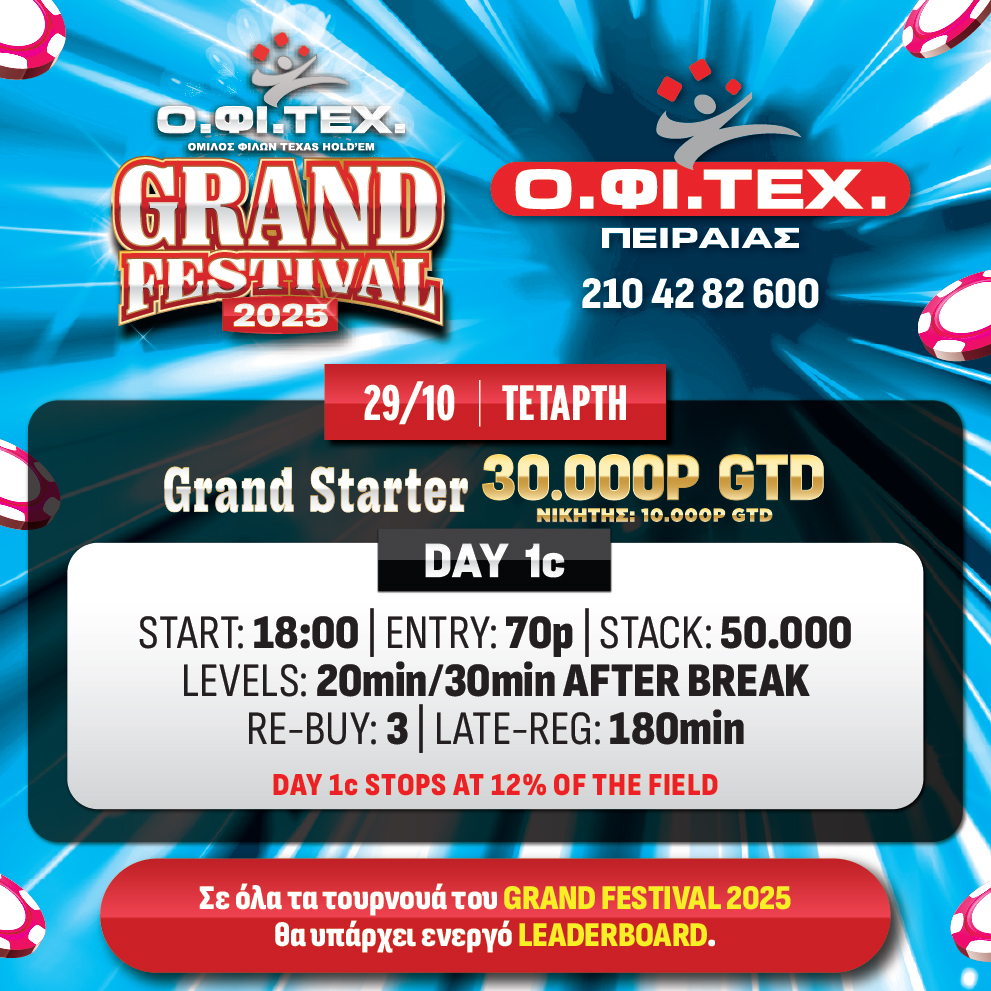Grand Starter Day 1c → Πόντοι: 70p → Μάρκες: 50.000 → Blinds Level: 20 Min/30 Min after break → Re-Buy: 3 → Late Reg. 180 Min