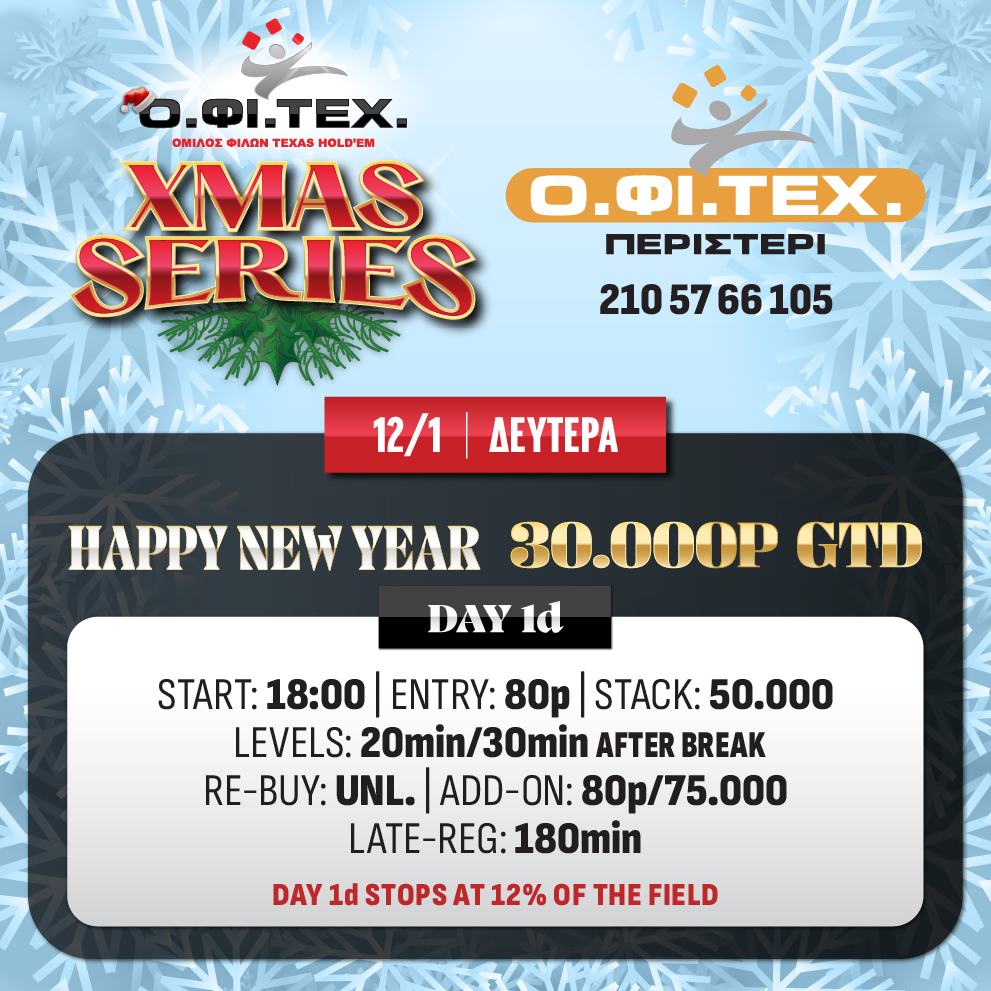 Happy New Year Day 1D → Πόντοι: 80 → Μάρκες: 50.000 → Blinds Level: 20 Min/30 Min after break → Re-Buy: Unlimited → Add-on: 80p/75.000 → Late Reg.: 180 Min. | DAY 1 STOPS AT 12% OF THE FIELD
