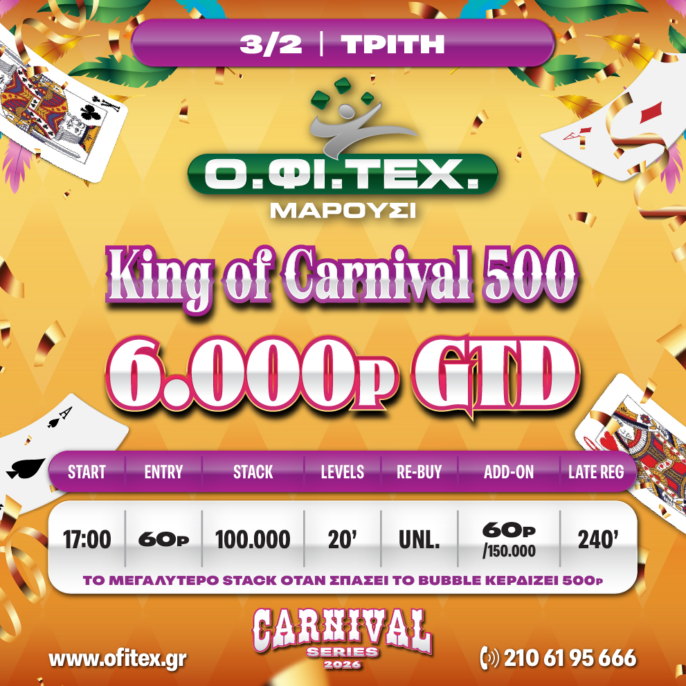 King of Carnival 500 → Πόντοι: 60p → Μάρκες: 100.000 → Blinds Level: 20 Min → Re-Buy: Unlimited → Add-on: 60p/150.000 → Late Reg. 240 Min