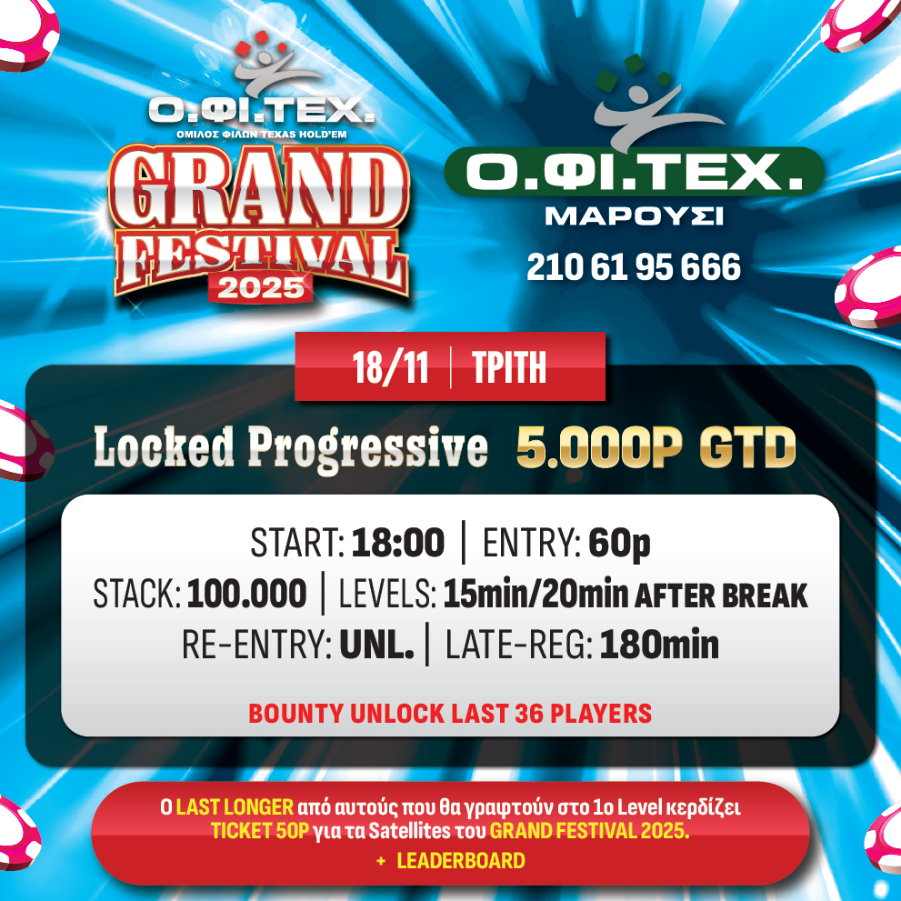 Locked Progressive → Πόντοι: 60 → Μάρκες: 100.000 → Blinds Level: 15 Min>20 Min after break → Re-Entry: Unlimited → Late Reg.: 180 Min.