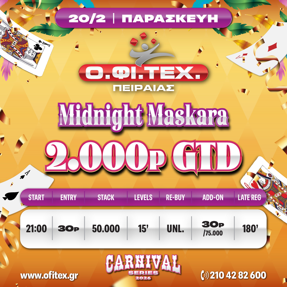 Midnight Maskara → Πόντοι: 30p → Μάρκες: 50.000 → Blinds Level: 15 Min → Re-Buy: Unlimited → Add-on: 30p/75.000 → Late Reg. 180 Min
