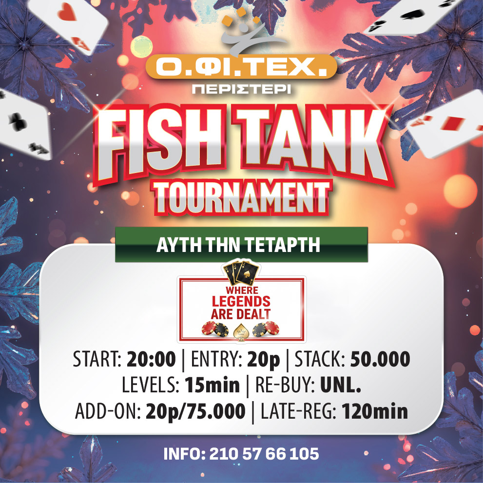 Fish Tank → Πόντοι: 20p → Μάρκες: 50.000 → Blinds Level: 15 Min → Re-Buy: UNLIMITED → Add-on: 20p/75.000 → Late Reg. 120′