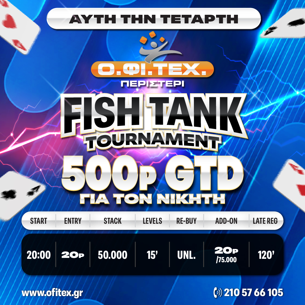 Fish Tank → Πόντοι: 20p → Μάρκες: 50.000 → Blinds Level: 15 Min → Re-Buy: UNLIMITED → Add-on: 20p/75.000 → Late Reg. 120′