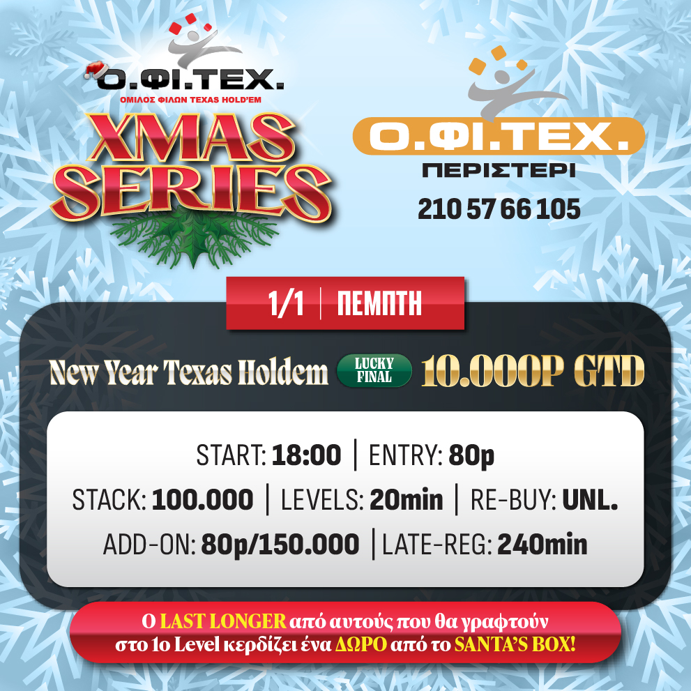 New Year Texas Holdem → Πόντοι: 80 → Μάρκες: 100.000 → Blinds Level: 20 Min → Re-Buy: Unlimited → Add-on: 80p/150.000 → Late Reg.: 240 Min.