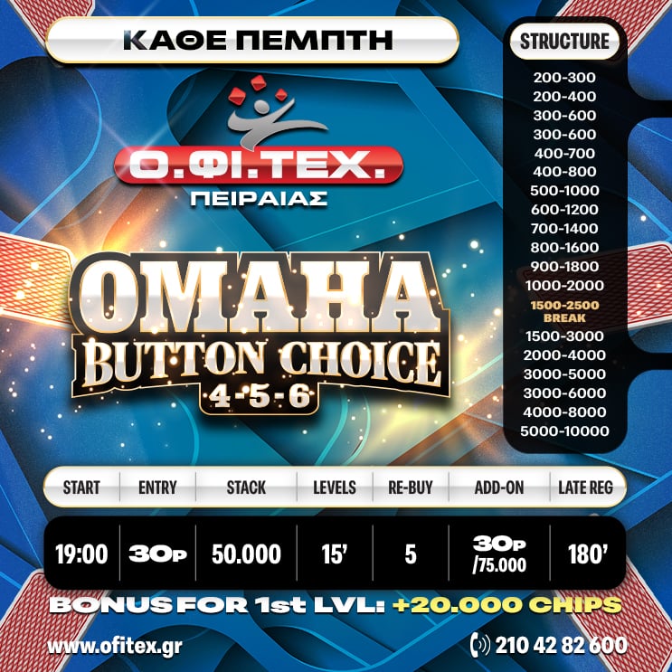 Omaha BTN Choice → Πόντοι: 30 → Μάρκες: 50.000 → Level: 15 Min → Rebuy: 5 → Add-on: 30p/75.000 → Late Reg. 180′