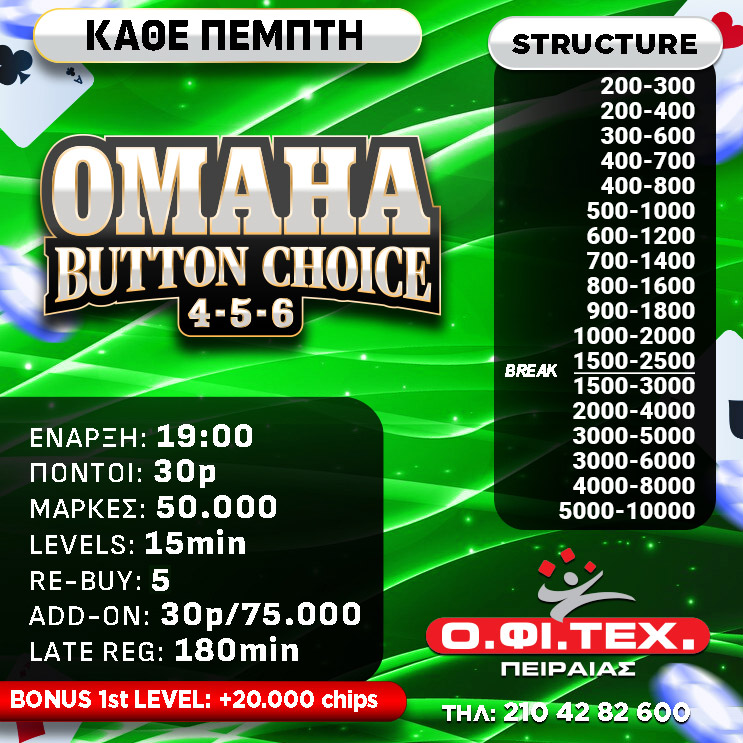 Omaha BTN ChoiceΠόντοι: 30 → Μάρκες: 50.000 → Level: 15 Min → Rebuy: 5 → Add-on: 30p/75.000 → Late Reg. 180′