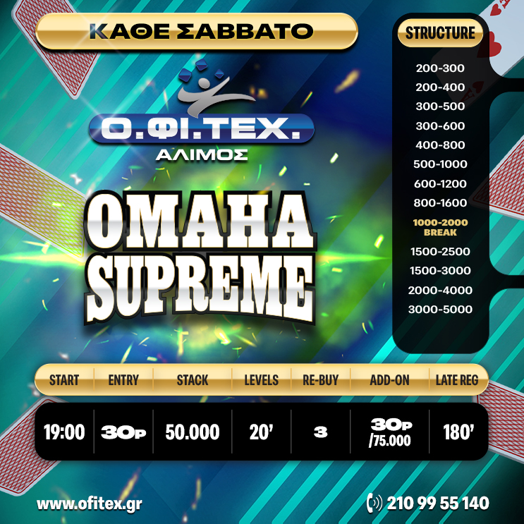 Omaha Supreme → Πόντοι: 30p → Μάρκες: 50.000 → Blinds Level: 20 Min → Re-Buy: 3 → Add-on: 20p/75.000 → Late Reg. 180′