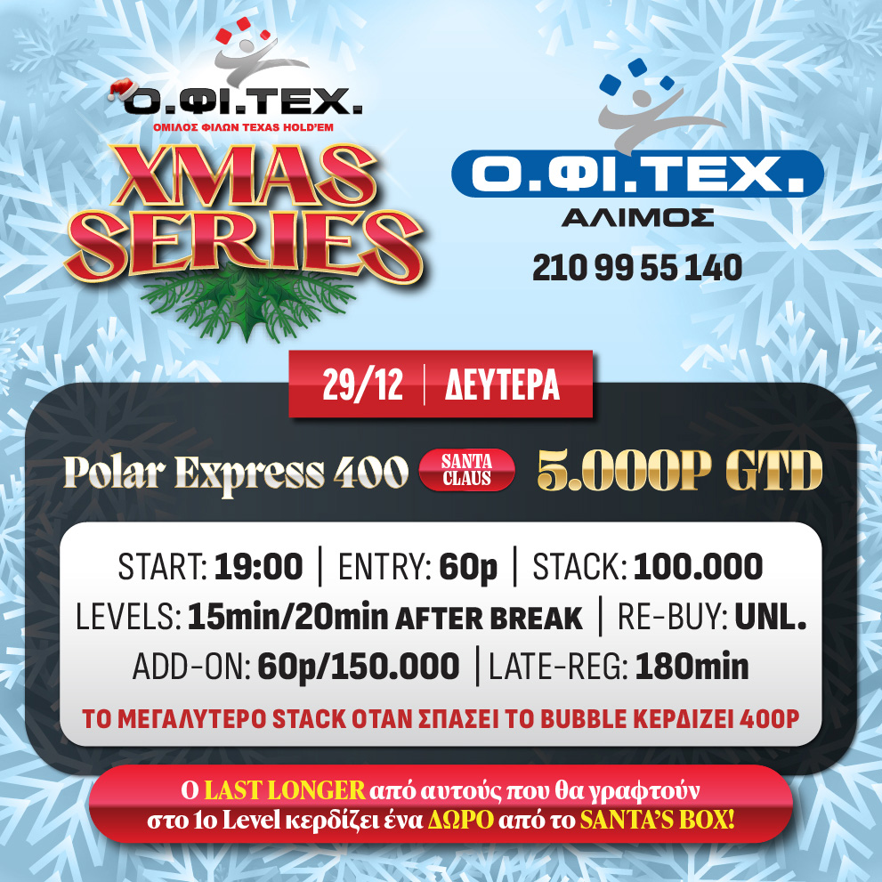 Polar Express 400 → Πόντοι: 60 → Μάρκες: 100.000 → Blinds Level: 15 Min/20 Min asfter break → Re-Buy: Unlimited → Add-on: 60p/150.000 → Late Reg.: 180 Min. | ΤΟ ΜΕΓΑΛΥΤΕΡΟ STACK ΟΤΑΝ ΣΠΑΣΕΙ ΤΟ BUBBLE ΚΕΡΔΙΖΕΙ 400p