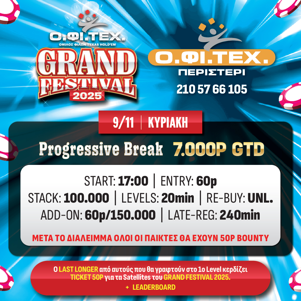 Progressive Break Πόντοι: 60 → Μάρκες: 100.000 → Blinds Level: 20 Min → Re-Buy: Unlimited → Add-on: 60p/150.000 → Late Reg.: 240 Min.
