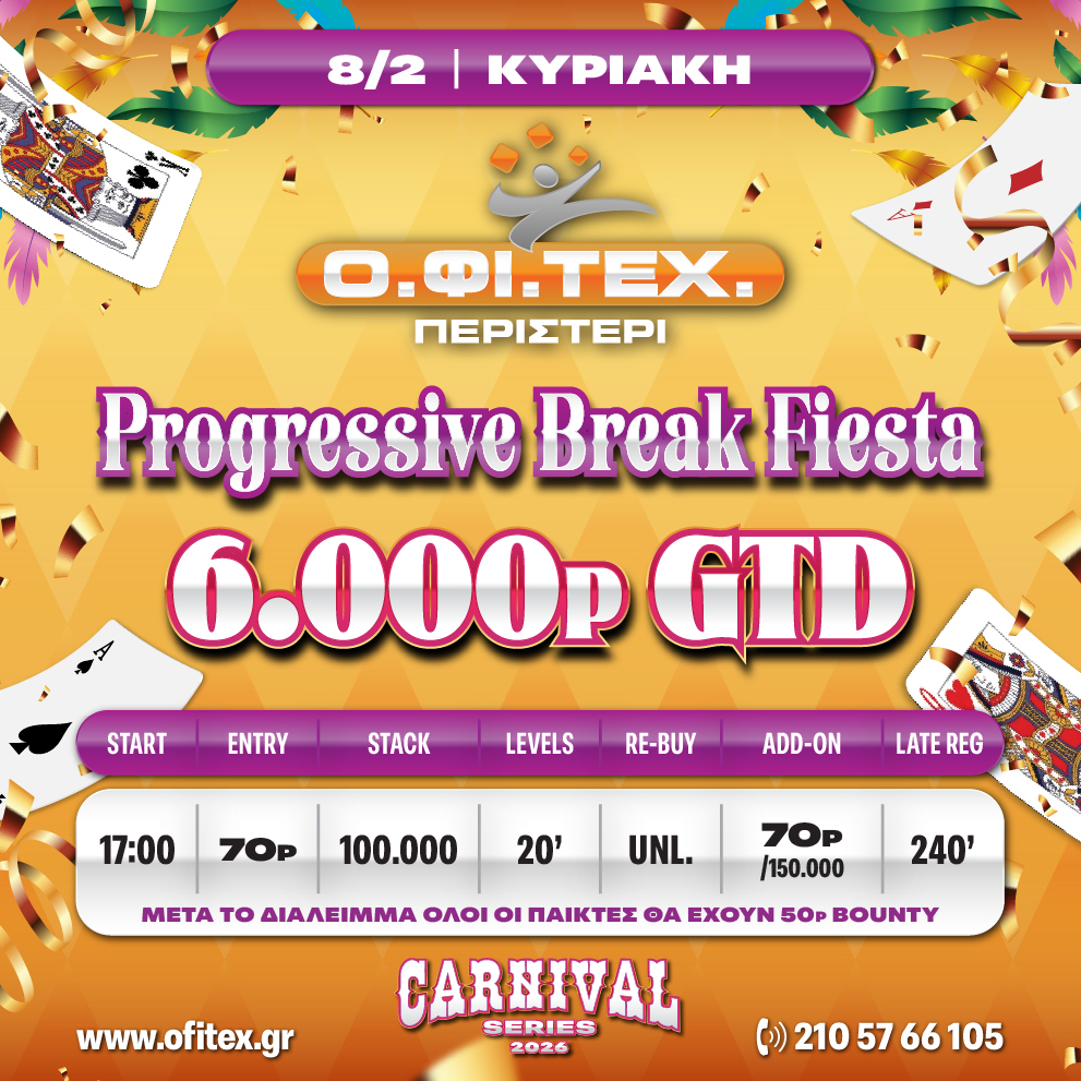 Progressive Break Fiesta → Πόντοι: 70p → Μάρκες: 100.000 → Blinds Level: 20 Min → Re-Buy: Unlimited → Add-on: 70p/150.000 → Late Reg. 240 Min