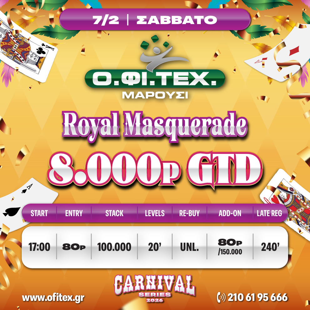 Royal Masquerade → Πόντοι: 80p → Μάρκες: 100.000 → Blinds Level: 20 Min → Re-Buy: Unlimited → Add-on: 80p/150.000 → Late Reg. 240 Min