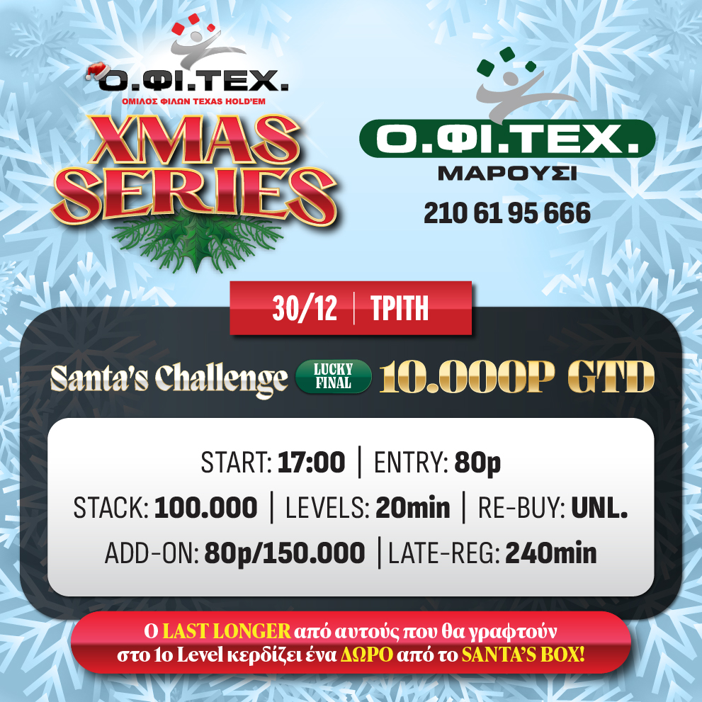 Santa’s Challenge → Πόντοι: 80 → Μάρκες: 100.000 → Blinds Level: 20 Min → Re-Buy: Unlimited → Add-on: 80p/150.000 → Late Reg.: 240 Min.