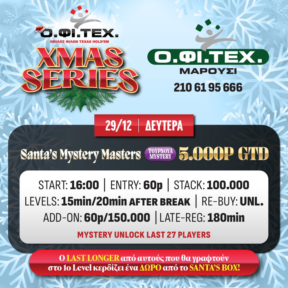 Santa’s Mystery Masters → Πόντοι: 60 → Μάρκες: 100.000 → Blinds Level: 15 Min/20 Min asfter break → Re-Buy: Unlimited → Add-on: 60p/150.000 → Late Reg.: 180 Min. | MYSTERY UNLOCKS AT LAST 27 PLAYERS