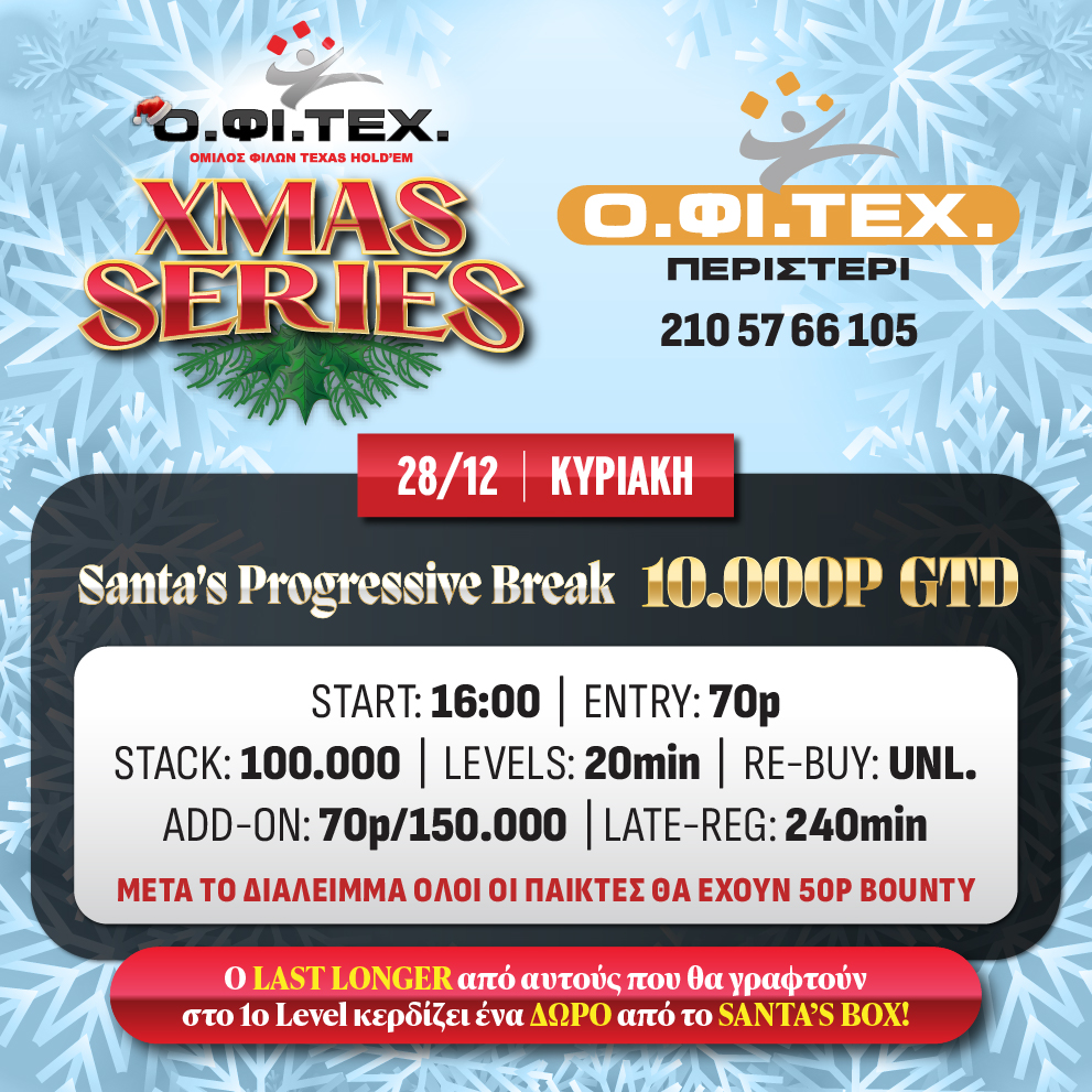 Santa’s Progressive Break → Πόντοι: 70 → Μάρκες: 100.000 → Blinds Level: 20 Min → Re-Buy: Unlimited → Add-on: 70p/150.000 → Late Reg.: 240 Min. | ΜΕΤΑ ΤΟ ΔΙΑΛΕΙΜΜΑ ΟΛΟΙ ΟΙ ΠΑΙΚΤΕΣ ΘΑ ΕΧΟΥΝ 50p BOUNTY