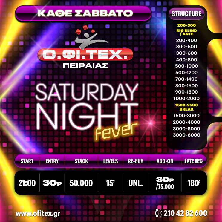 Saturday Night Fever → Πόντοι: 30p → Μάρκες: 50.000 → Blinds Level: 15 Min → Re-Buy: UNLIMITED → Add-On: 30p/75.000 → Late Reg. 180′