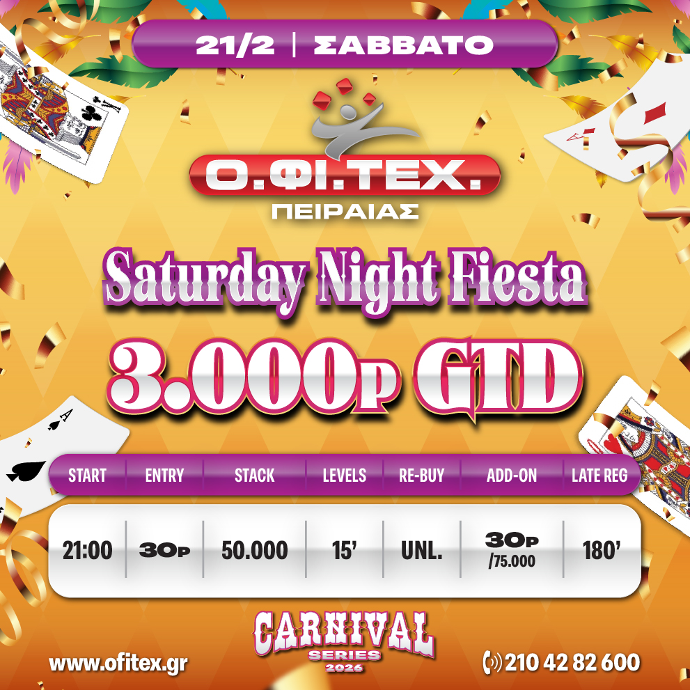 Saturday Night Fiesta → Πόντοι: 30p → Μάρκες: 50.000 → Blinds Level: 15 Min → Re-Buy: Unlimited → Add-on: 30p/75.000 → Late Reg. 180 Min
