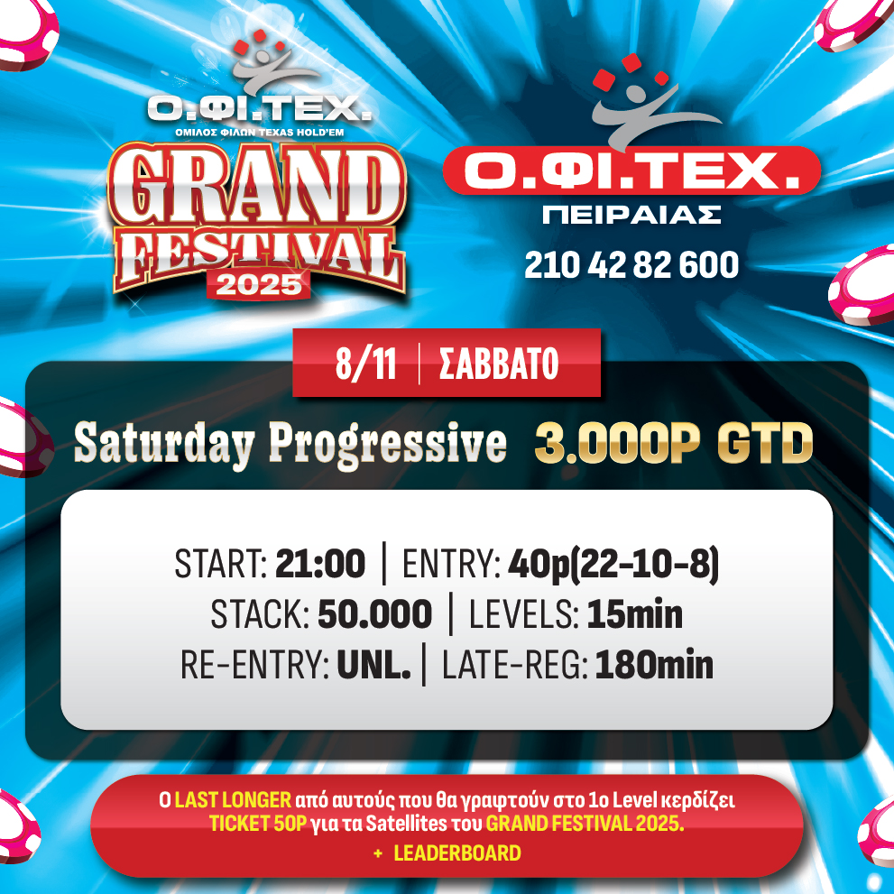 Saturday Progressive → Πόντοι: 40 (22+10+8) → Μάρκες: 50.000 → Blinds Level: 15 Min → Re-Entry: Unlimited → Late Reg.: 180 Min.