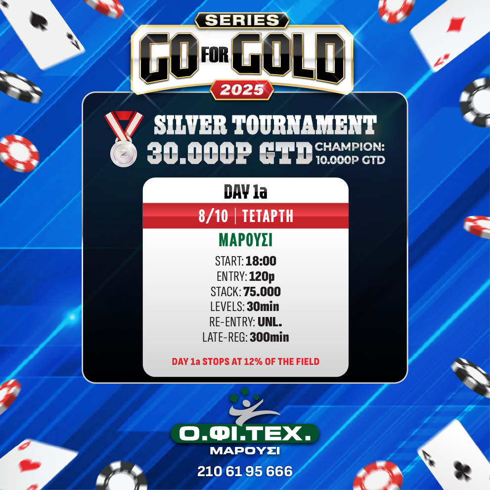 Silver Tournament Day 1a → Πόντοι: 120p → Μάρκες: 75.000 → Blinds Level: 30 Min → Re-Entry: Unlimited → Late Reg. 300 Min