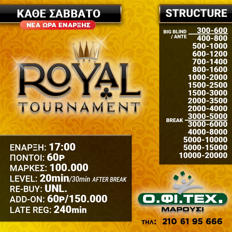Special Royal Tournament → Πόντοι: 60p → Μάρκες: 100.000 → Level: 20 Min – 30 Min After break → Re-Buy: UNLIMITED → Add-on: 60p/150.000 → Late Reg. 240′