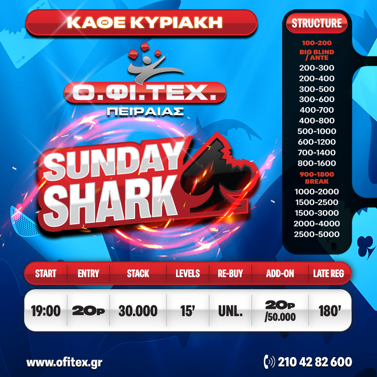 Sunday Shark → Πόντοι: 20p → Μάρκες: 30.000 → Blinds Level: 15 Min → Re-Buy: UNLIMITED → Add-on: 20p/50.000 → Late Reg. 180′