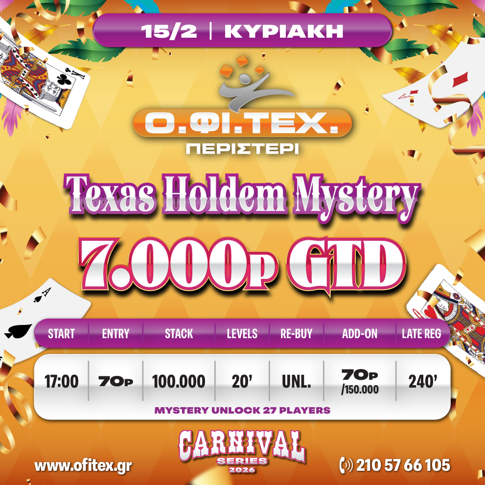 Texas Holdem Mystery → Πόντοι: 70p → Μάρκες: 100.000 → Blinds Level: 20 Min → Re-Buy: Unlimited → Add-on: 70p/150.000 → Late Reg. 240 Min