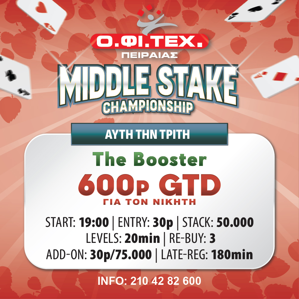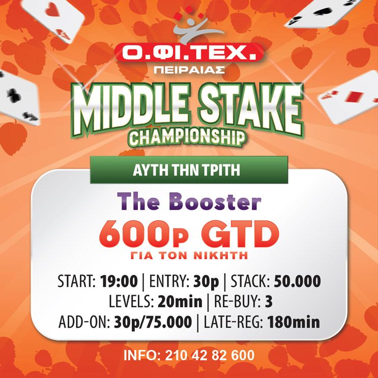 The Booster Tournament → Πόντοι: 30 → Μάρκες: 50.000 → Level: 20 Min → Rebuy: 3 → Add-on: 30p/75.000 → Late Reg. 180′