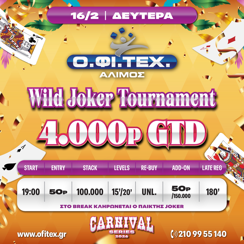 Wild Joker Tournament → Πόντοι: 50p → Μάρκες: 100.000 → Blinds Level: 15 Min / 20 Min after break → Re-Buy: Unlimited → Add-on: 50p/150.000 → Late Reg. 180 Min