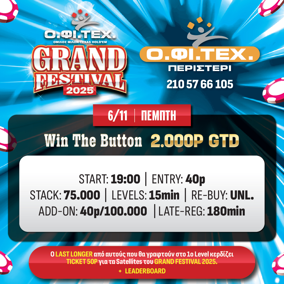Win the Button → Πόντοι: 40 → Μάρκες: 75.000 → Blinds Level: 15 Min → Re-Buy: Unlimited → Add-on: 40p/100.000 → Late Reg.: 180 Min.