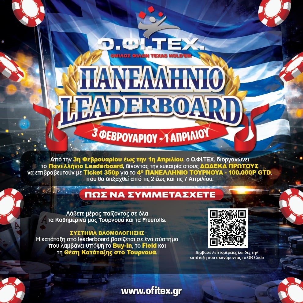 Η κατάταξή σου στο Leaderboard προκύπτει με βάση: ✔️ Το Buy-in ✔️ Το μέγεθος του field ✔️ Τη θέση τερματισμού σε κάθε τουρνουά!